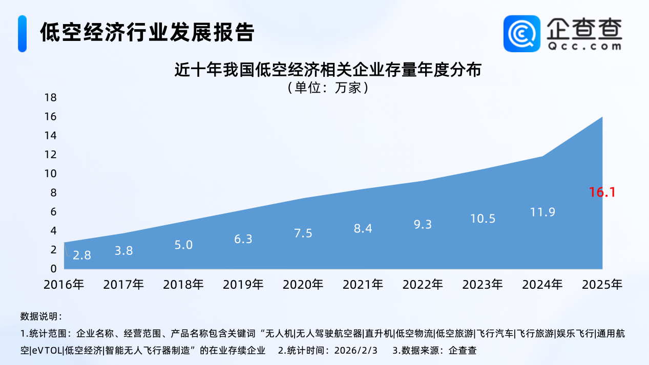近十年,我国低空经济相关企业存量逐年增加,2023年相关企业存量正式突破10万家,达10.5万家;2025年我国低空经济相关企业存量增速加快,年底在业存续16.1万家低空经济相关企业。截至2026年2月3日,我国现存16.4万家低空经济相关企业。