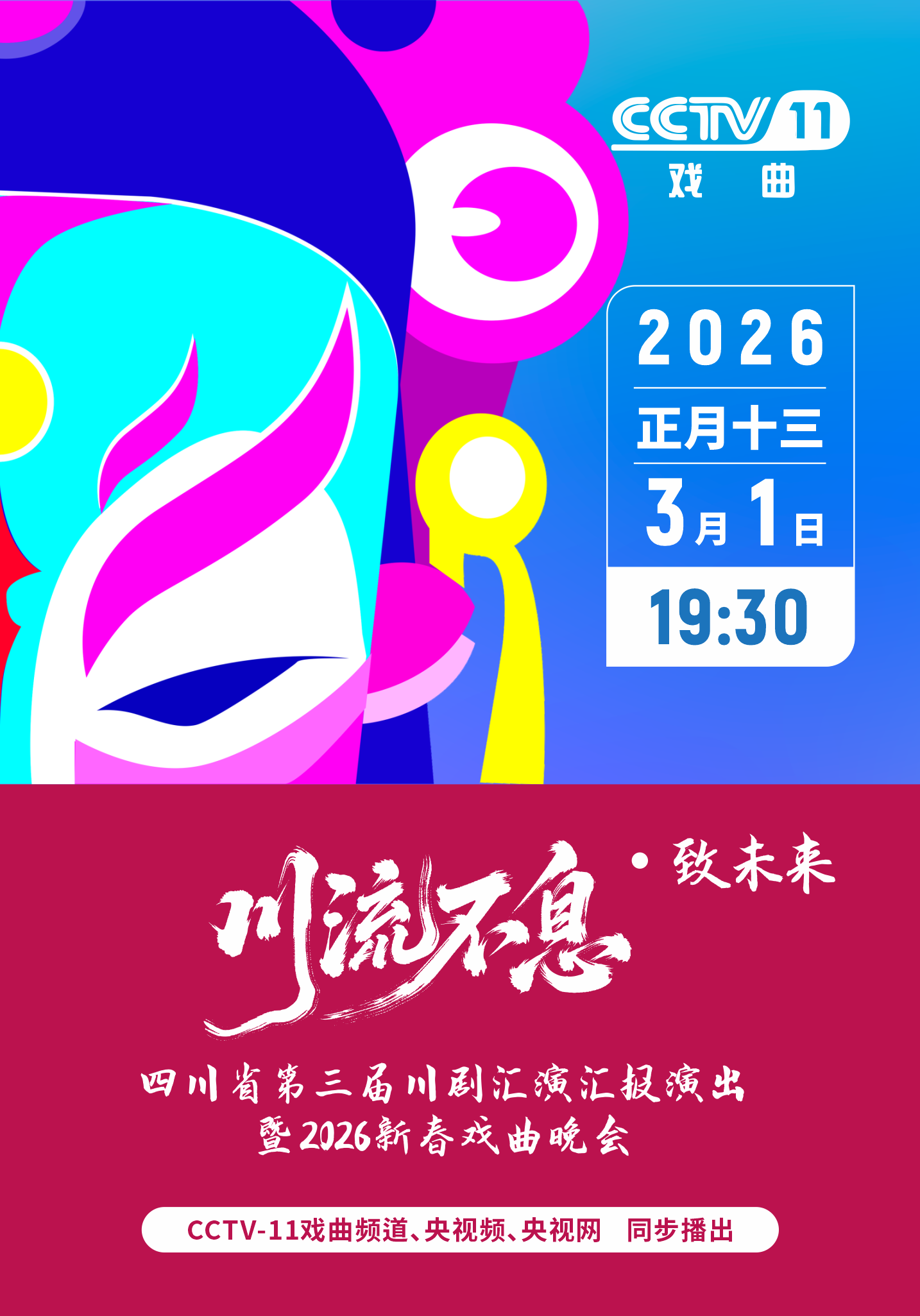 3 月 1 日(农历正月十三)19:30 ,“川流不息·致未来”——四川省第三届川剧汇演汇报演出暨2026 新春戏曲晚会 ,将在CCTV-11戏曲频道、央视频、央视网同步播出,为全国观众精心呈现一场守正创新、韵味悠长的川剧视听盛宴。